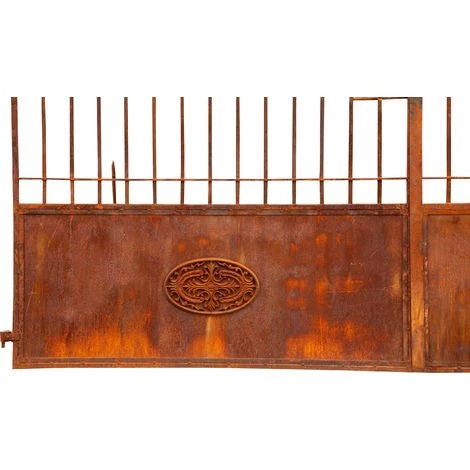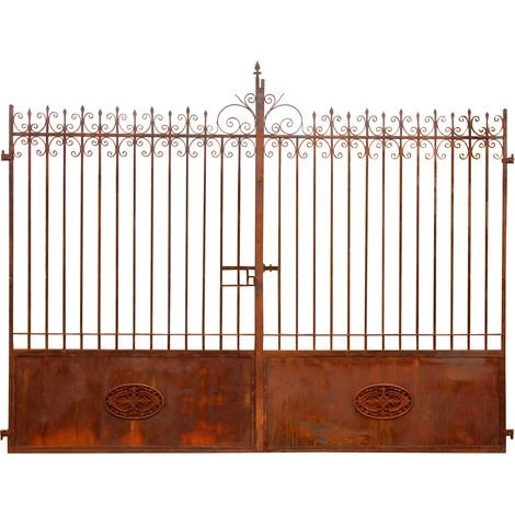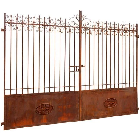 Portail en fer forgé à la main non peint. Dimensions : longueur 332 cm, profondeur 8 cm, hauteur 254 cm. Le fer est laissé naturel. Le design rappelle les formes des portes anciennes et traditionnelles. Il existe un vaste catalogue d’articles de mobilier de jardin, d’idées de meubles d’extérieur, d’articles de décoration de jardin, de meubles d’intérieur pour meubler et décorer la maison, d’idées d’aménagement de la maison et de meubles en bois pour les meubles de cuisine, les meubles de salon, les meubles de salle de bains, les meubles de chambre à coucher, les meubles de bureau. Toutes les mesures se réfèrent à la taille maximale de l’article.