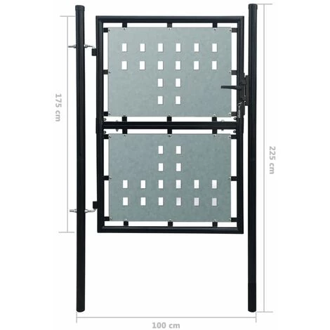 Ce portail de clôture sera une porte d’entrée pratique au style moderne pour isoler votre jardin du monde extérieur. Très stable et durable, le portail de clôture formera une barrière de sécurité pratique pour votre jardin, patio ou terrasse. Les tôles galvanisées avec des motifs de trous décoratifs renforcent le cadre, donc notre porte de jardin offrira un degré élevé de sécurité, tout en formant une fabuleuse entrée sur votre propriété. Fabriqué en acier robuste, le portail est enduit de poudre contre la rouille et la corrosion. Ce portail a deux poteaux solides avec des charnières robustes pour une installation facile et un système de verrou robuste avec trois clés correspondantes incluses également dans la livraison. Ce portail de jardin combine habilement style, robustesse, stabilité et résistance à la corrosion !Couleur : noirMatériau : Acier avec finition en poudreDimensions totales du portail : 100 x 225 cm (l x H)Dimensions du panneau de porte : 85 x 175 cm (l x H)Hauteur du poteau : 225 cmVerrou robuste avec 3 clés correspondantes (incluses)2 poteaux avec charnières robustes pour une installation facileNous ne livrons pas en Corse.