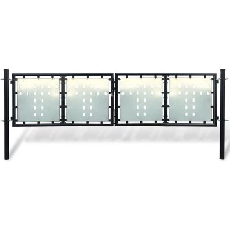 Ce portail de clôture sera une porte d’entrée pratique au style moderne pour isoler votre jardin du monde extérieur. Très stable et durable, le portail de clôture formera une barrière de sécurité pratique pour votre jardin, patio ou terrasse. Les tôles galvanisées avec des motifs de trous décoratifs renforcent le cadre, donc notre porte de jardin offrira un degré élevé de sécurité, tout en formant une fabuleuse entrée sur votre propriété. Fabriqué en acier robuste, le portail est enduit de poudre contre la rouille et la corrosion. Ce portail a deux poteaux solides avec des charnières robustes pour une installation facile et un système de verrou robuste avec trois clés correspondantes incluses également dans la livraison. Ce portail de jardin combine habilement style, robustesse, stabilité et résistance à la corrosion !Couleur : noirMatériau : Acier avec finition en poudreDimensions totales du portail : 300 x 125 cm (l x H)Dimensions du panneau de porte simple : 141 x 75 cm (l x H)Hauteur du poteau : 125 cmVerrou robuste avec 3 clés correspondantes (incluses)2 poteaux avec charnières robustes pour une installation facileNous ne livrons pas en Corse.
