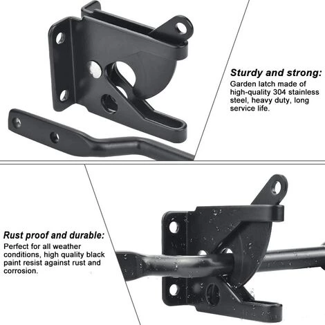 Acier inoxydable 304 de haute qualité : ce verrou automatique de jardin est fabriqué en acier inoxydable 304 de haute qualité et est revêtu d’un revêtement époxy noir. La structure robuste garantit que la serrure de porte de jardin est durable et fiable, et le revêtement en poudre noir empêche d’endommager les composants. Réduit l’usure, ce qui le rend idéal pour une utilisation externe.
