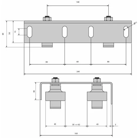 Guide supérieur réglable, avec 4 olives en nylon Ø45 pour portail coulissant de 30 à 62 mm d’épaisseur.